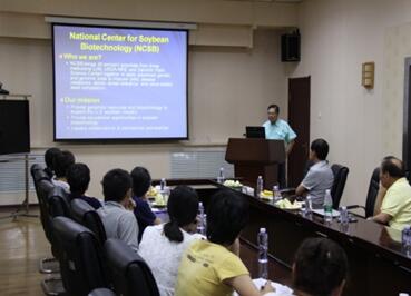 訪問期間Henry T. Nguyen教授介紹了美國密蘇里大豆生物技術中心的研究領域及成果。他的團隊主要從事大豆高產、抗包囊線蟲及抗病性、非生物脅迫和大豆品質方面的分子遺傳特性研究,目的是為美國大豆產業(yè)的發(fā)展提供良好基因資源。目前Henry T. Nguyen教授的團隊利用分子遺傳技術,育成了可代替橄欖油的高油酸大豆品種,已在生產上應用,預計在未來幾年有望大面積推廣。會議期間Henry T. Nguyen教授對參會師生提出的具體問題進行了詳細的分析與解答。交流會后,倆位專家參觀了我所的實驗室和試驗基地。