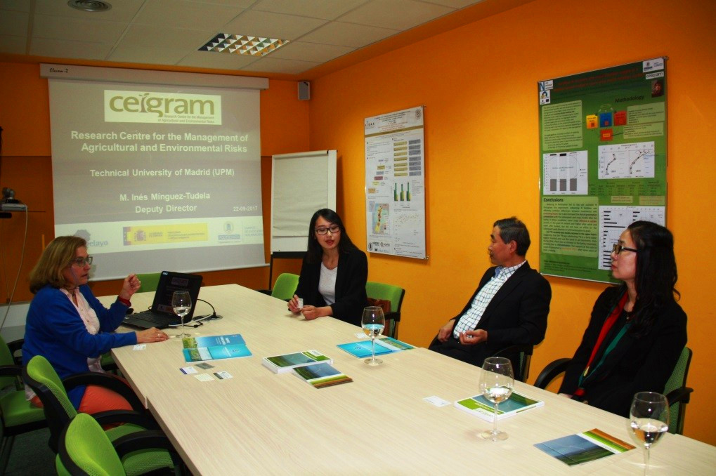 代表團(tuán)一行還順訪了西班牙馬德里理工大學(xué)的農(nóng)業(yè)與環(huán)境風(fēng)險管理研究中心。農(nóng)業(yè)與環(huán)境風(fēng)險管理研究中心主任Ines Minguez教授接待了代表團(tuán),并詳細(xì)介紹了西班牙農(nóng)業(yè)概況、農(nóng)業(yè)面臨的威脅與風(fēng)險、農(nóng)業(yè)保險制度等,同時也向代表團(tuán)展示了農(nóng)業(yè)與環(huán)境風(fēng)險管理研究中心的作用、人力資源基礎(chǔ)設(shè)施、國際研究合作伙伴、政府合作項目等工作。