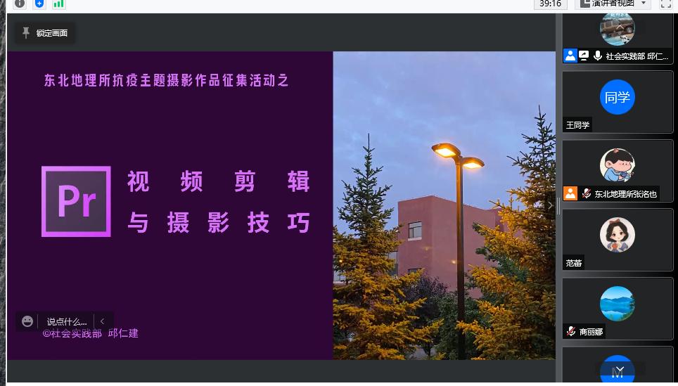 為全面記錄和保存東北地理所上下眾志成城、共克時艱的感人畫面,展現(xiàn)影像“存憑、留史、資政、育人”的特殊價值。2022年4月1日,東北地理所研究生會舉辦“視頻剪輯與攝影技巧”線上培訓活動。此次培訓邀請2020級邱仁建博士主講,我所30余名職工及和各年級研究生參與了此次培訓。