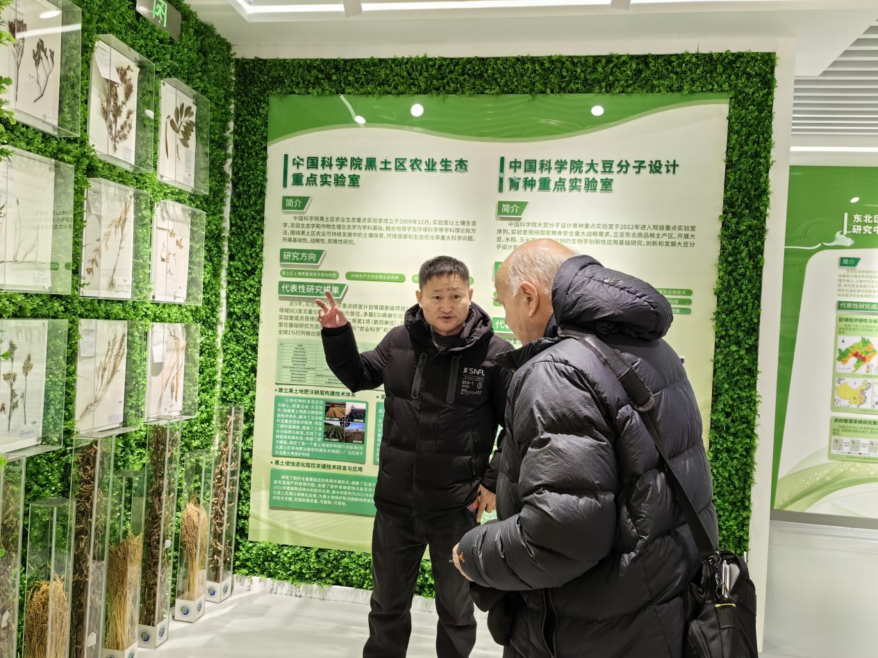 報告會后,在黃迎新研究員的陪同下,Cory Matthew教授參觀了黑土糧倉科技會戰指揮中心宣傳展示平臺,黃迎新研究員詳細介紹了黑土糧倉科技會戰實施以來,取得的重要成果和技術突破。
