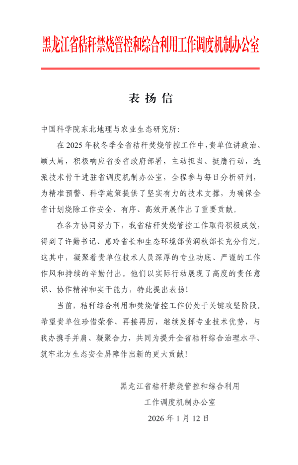 近日,黑龍江省秸稈禁燒管控和綜合利用工作調(diào)度機(jī)制辦公室以信函形式對(duì)中國科學(xué)院東北地理與農(nóng)業(yè)生態(tài)研究所予以表揚(yáng),對(duì)東北地理所在2025年秋冬季秸稈焚燒管控工作中的重要貢獻(xiàn)表示感謝。濕地與全球變化學(xué)科組陳衛(wèi)衛(wèi)研究團(tuán)隊(duì)參與構(gòu)建黑龍江省秸稈數(shù)智化管控平臺(tái),并選派技術(shù)骨干石博文、王梧陽、邢文甫等人全程參與省級(jí)調(diào)度和分析,為精準(zhǔn)預(yù)警和科學(xué)施策提供了關(guān)鍵科技支撐。