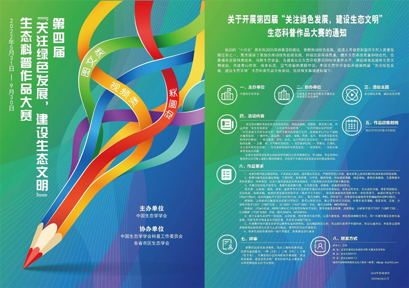 我國的“十四五”規(guī)劃和2035年遠(yuǎn)景目標(biāo)建議,要把推動綠色發(fā)展,促進(jìn)人與自然和諧共生列入重要發(fā)展任務(wù)之一,重點強(qiáng)調(diào)了要加快推動綠色低碳發(fā)展,持續(xù)改善環(huán)境質(zhì)量,提升生態(tài)系統(tǒng)質(zhì)量和穩(wěn)定性,全面提高資源利用效率,保障生態(tài)安全。為提高公眾生態(tài)環(huán)境意識和科學(xué)素養(yǎng)水平,推進(jìn)綠色發(fā)展和生態(tài)文明建設(shè),共建青山常在、綠水長流、空氣常新的美麗中國,中國生態(tài)學(xué)學(xué)會擬開展第四屆“關(guān)注綠色發(fā)展,建設(shè)生態(tài)文明”生態(tài)科普作品大賽活動。現(xiàn)將有關(guān)事項通知如下: