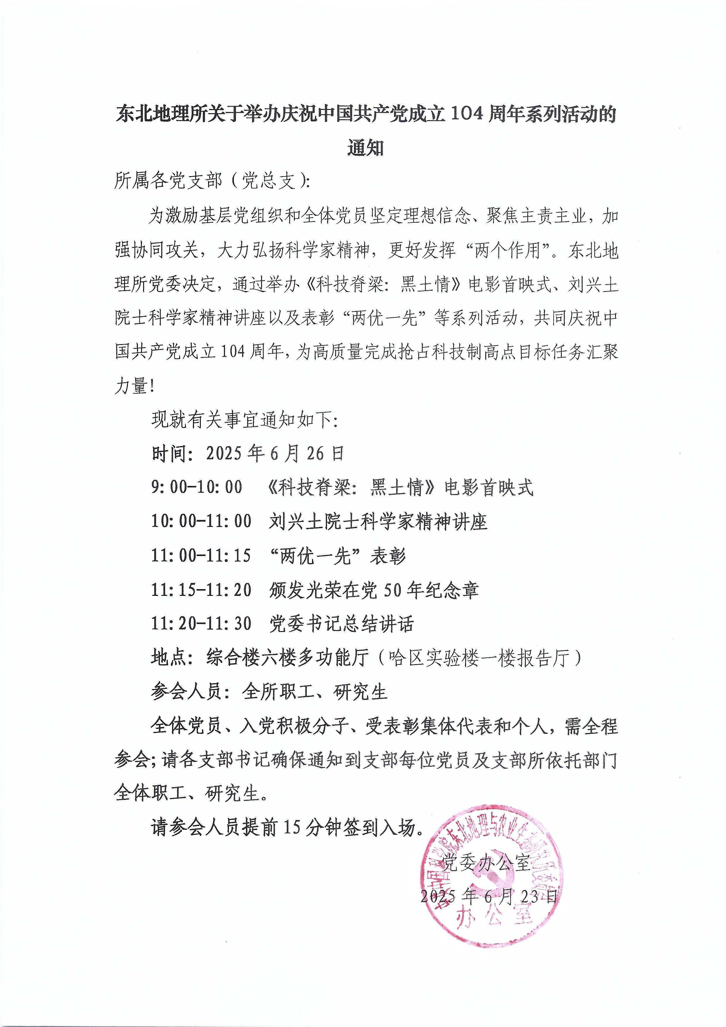 東北地理所關(guān)于舉辦慶祝中國共產(chǎn)黨成立104周年系列活動的通知