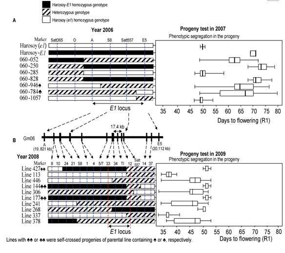 大豆是敏感型高溫短日作物,適應(yīng)于高緯度環(huán)境的大豆栽培種對(duì)光周期必須具有不敏感性。經(jīng)典遺傳學(xué)研究表明:4個(gè)主要位點(diǎn)E1、 E3、E4和 E7被證明參與控制這種不敏感性。其中,E1 位點(diǎn)是Bernard于1971年發(fā)現(xiàn)并命名的,但由于該基因位于第六號(hào)染色體(LG C2)中心粒著絲點(diǎn)附近,遺傳重組率極低,致使人們一直未揭開(kāi)E1基因的神秘面紗。東北地理所大豆分子育種創(chuàng)新團(tuán)隊(duì)繼圖位克隆了E3 (Genetics,2009)、E4 (Genetics,2008)基因后,夏正俊研究員與日本科學(xué)家一道經(jīng)過(guò)近十年的潛心研究,利用最為經(jīng)典的圖位克隆法一步一步準(zhǔn)確地將E1基因克隆。進(jìn)一步研究表明:該基因含有一個(gè)核定位信號(hào),C端含有與植物轉(zhuǎn)錄因子B3遠(yuǎn)緣相近的結(jié)構(gòu)域,是一類(lèi)新型的豆科作物特有的轉(zhuǎn)錄因子;研究結(jié)果揭示了豆科植物具有獨(dú)特的光周期調(diào)控開(kāi)花網(wǎng)絡(luò);為大豆光周期調(diào)控開(kāi)花的分子機(jī)理研究和超早熟新品種的分子設(shè)計(jì)奠定了堅(jiān)實(shí)的理論基礎(chǔ)。因?yàn)镋1基因?qū)Υ蠖蛊贩N的生育期與光周期反應(yīng)起決定性作用,可以說(shuō)此項(xiàng)研究的重大突破是自1920年大豆光周期現(xiàn)象發(fā)現(xiàn)以來(lái),我國(guó)科學(xué)家對(duì)該領(lǐng)域最重要的貢獻(xiàn)。同時(shí),進(jìn)一步強(qiáng)化了我所在大豆光周期研究領(lǐng)域的國(guó)際領(lǐng)先地位。主要研究結(jié)果已于2012年5月22日在線發(fā)表在在美國(guó)科學(xué)院院刊PNAS上。