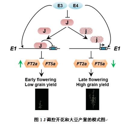E3E4誘導調控E1是通過E3E4抑制調控J轉錄表達,然后J抑制調控E1轉錄表達來完成,J蛋白能夠直接結合到E1啟動子上抑制其表達,從而釋放了E1對FT轉錄抑制,而誘導大豆開花與成熟。