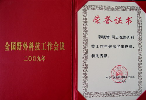 2009年6月16日,科技部在北京組織召開全國首次野外科技工作會議,對在野外科技工作中做出突出成績的先進集體和個人進行了表彰。我所三江平原沼澤濕地生態試驗站站長宋長春研究員,海倫農田生態系統國家野外研究站站長韓曉增研究員喜獲“全國野外科技工作先進個人”稱號。
