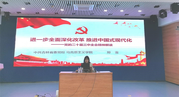 本次主題黨團日活動邀請了中共吉林省委黨校馬克思主義學院副院長鄭雪副教授,以《進一步全面深化改革推進中國式現(xiàn)代化---黨的二十屆三中全會精神解讀》為題,深入的為全所學生黨員、團員解讀了黨的二十屆三中全會精神。