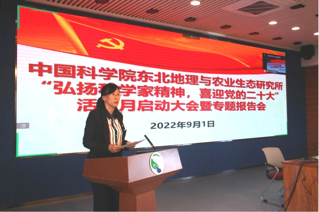 王曉慧在動員講話中指出,9月是本所“弘揚科學家精神,喜迎黨的二十大”主題活動月,本次弘揚科學家精神專題報告會暨本所主題活動月的啟動大會,標志著主題活動月正式開啟。她強調,組織開展“弘揚科學家精神,喜迎黨的二十大”系列活動是深入實施“傳承老科學家精神 弘揚新時代科學家精神在行動”專項工作的具體舉措,旨在推動全所職工、研究生踐行科學家精神、建功立業新時代,以良好精神面貌和優異科研成績迎接黨的二十大勝利召開。她依據《東北地理所“弘揚科學家精神,喜迎黨的二十大”活動月工作方案》部署推進重點工作,并提出具體要求。她強調,各黨支部(黨總支)要結合本所使命定位和發展歷史,深入挖掘一代代科學家攻堅克難、科技創新、奮斗圓夢的科學探索故事和科學家精神內涵,多措并舉開展系列“弘揚科學家精神”主題活動,提振科技人員精氣神,鼓舞和激勵廣大科研工作者主動對標職責使命,賡續創新奮斗的精神血脈,不斷強化勇攀科學高峰、勇擔時代使命,爭做高水平科技自立自強排頭兵的責任意識和使命意識,以新成績續寫新時代科學家精神的精彩華章。