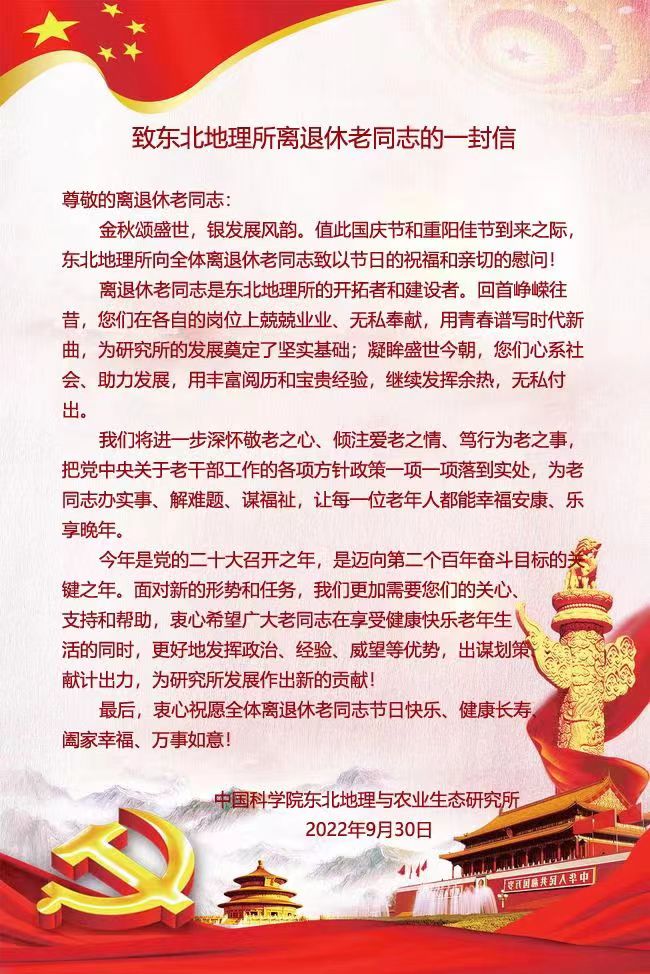 金秋十月,神州大地天清氣朗,山河錦繡。中國(guó)共產(chǎn)黨第二十次全國(guó)代表大會(huì)在舉世矚目中圓滿(mǎn)完成各項(xiàng)議程和崇高使命,歷時(shí)7天勝利閉幕。這是一次舉旗定向、凝聚力量、團(tuán)結(jié)奮進(jìn)的大會(huì),在黨和國(guó)家發(fā)展進(jìn)程中具有極其重大的歷史意義。東北地理所作為國(guó)家戰(zhàn)略科技力量,深入理解和準(zhǔn)確把握黨的二十大提出的各項(xiàng)工作部署至關(guān)重要。所黨委從迎接黨的二十大到學(xué)習(xí)宣傳貫徹黨的二十大精神都做出了明確的部署和具體的安排。針對(duì)離退休干部隊(duì)伍的特點(diǎn),東北地理所組織開(kāi)展形式多樣的活動(dòng),迎接黨的二十大和學(xué)習(xí)宣傳貫徹黨的二十大精神,切實(shí)引領(lǐng)離退休干部感黨恩、聽(tīng)黨話(huà)、跟黨走,為黨的事業(yè)傳播好聲音、匯聚正能量、作出新貢獻(xiàn)。