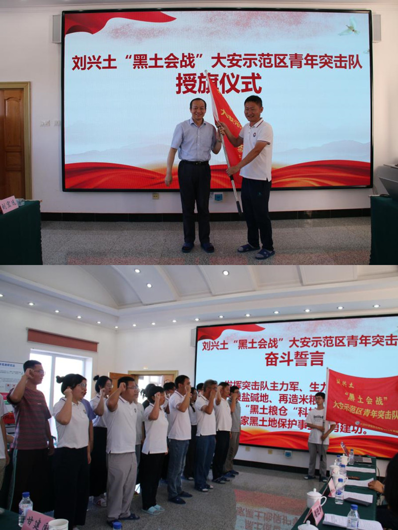 座談會上舉辦了以老科學家命名的突擊隊授旗儀式。文波龍副研究員簡要介紹劉興土院士先進事跡,李和風向劉興土“黑土會戰(zhàn)”大安示范區(qū)青年突擊隊授旗,青年突擊隊進行奮斗誓言宣誓,錚錚誓言,體現(xiàn)了新一代的科研工作者以老科學家精神為引領,緊密圍繞國家重大戰(zhàn)略需求奮勇建功的信心和決心。