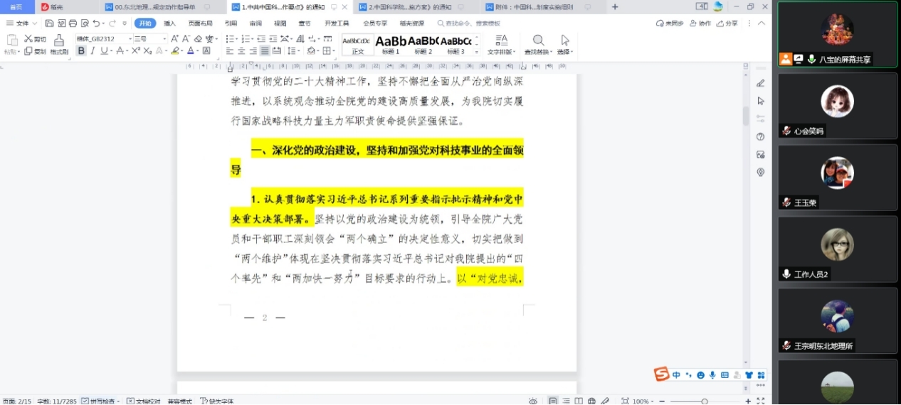 會前,各位黨員已經(jīng)自學了《中國科學院2022年黨的建設(shè)工作要點》、《中國科學院“基層組織建設(shè)見成效”活動實施方案》。會上,郭琳對兩個文件的要點進行了領(lǐng)學,對重點內(nèi)容進行了詳細介紹,并對下一步工作開展和落實提出要求,便于人事黨支部在恢復正常上班后相關(guān)工作的開展。郭琳還強調(diào)了意識形態(tài)工作,請各位黨員提高思想意識,積極傳播正能量。