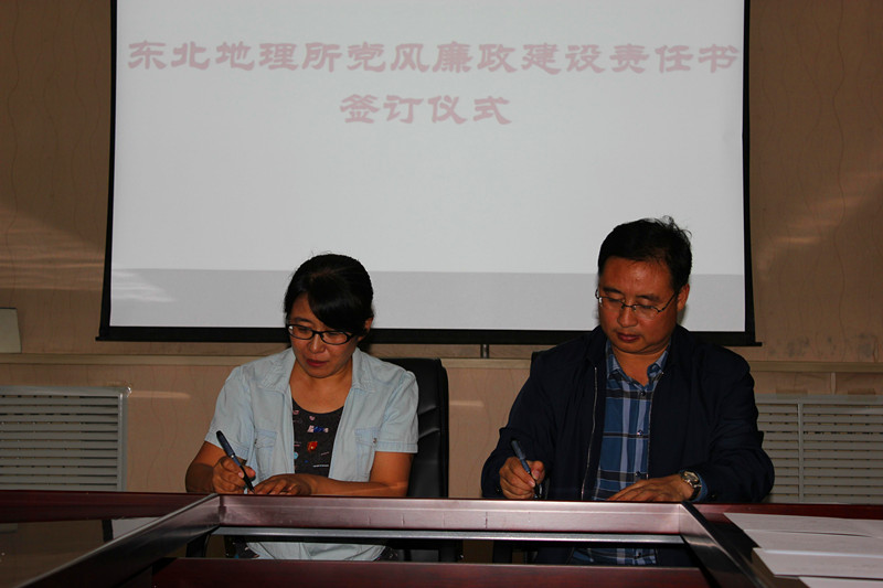 簽署儀式上,東北地理所所長何興元、黨委書記蘇陽分別與所班子成員、所班子成員與分管的各職能部門、重點實驗室、支撐部門負責人分別簽訂了責任書《中國科學院東北地理與農業生態研究所反腐倡廉建設責任書》。